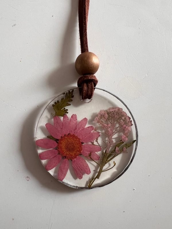 Collares redondos de resina con flores secas 5cm de diámetro. Cordón de gamuza y esfera para ajuste de largo del collar.