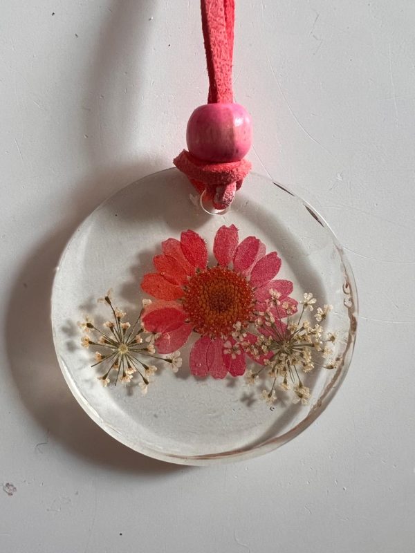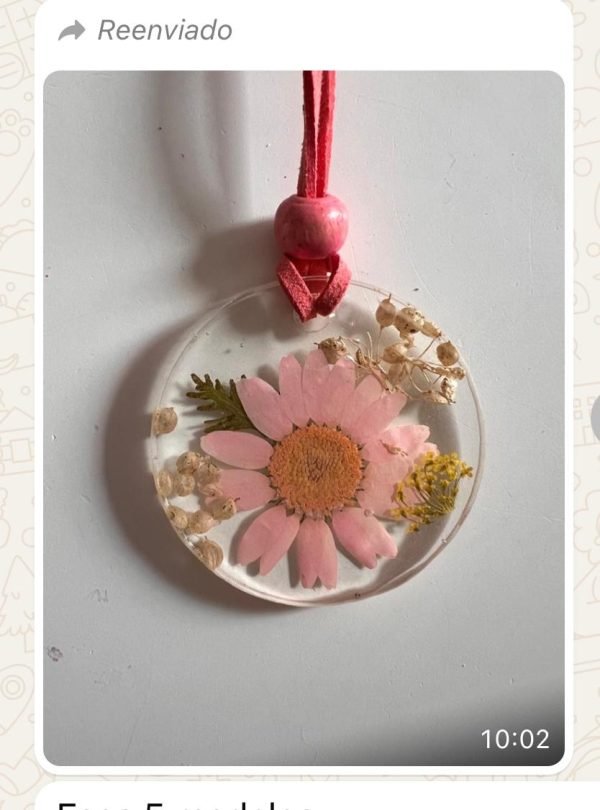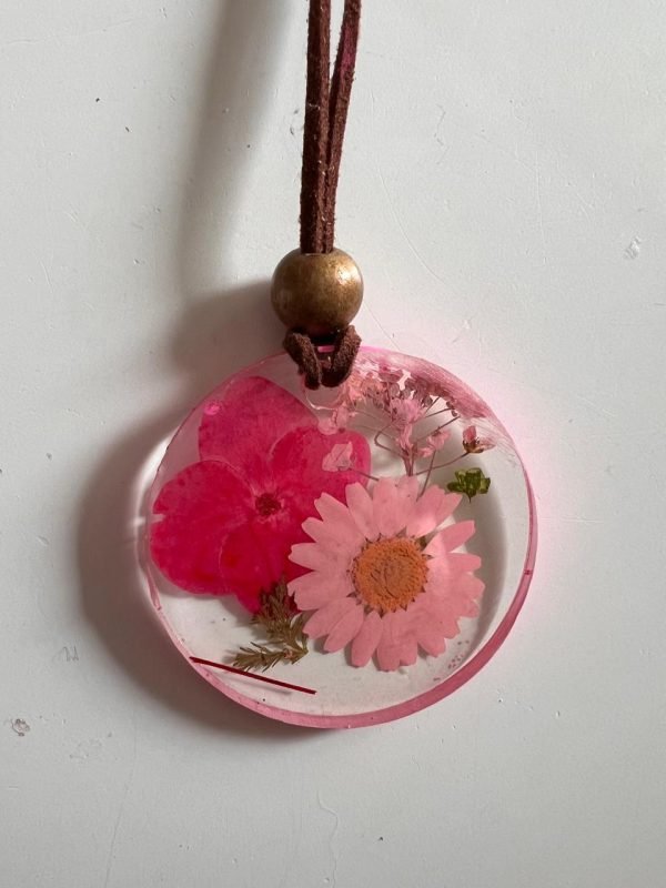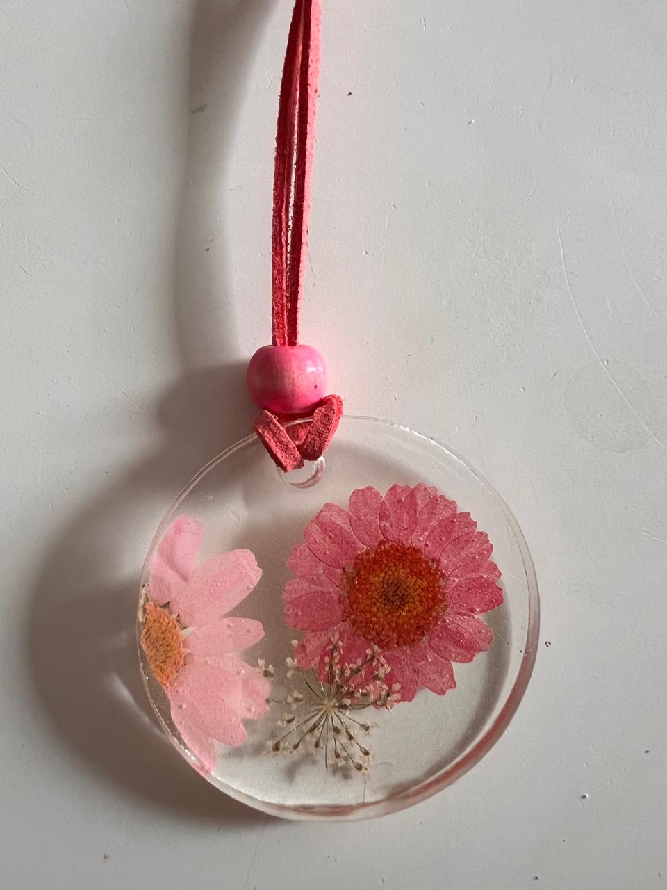 Collares redondos de resina con flores secas 5cm de diámetro. Cordón de gamuza y esfera para ajuste de largo del collar.